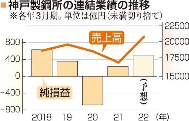 神鋼、純利益500億円に上方修正 自動車向け鋼材の需要拡大 22年3月期神戸製鋼所(神戸市中央区)は5日、2022年3月期連結決算の業績予想を上方修正し、最終的なもうけを示す純利益が500億円(前期は232億円)になりそうだと発表した。